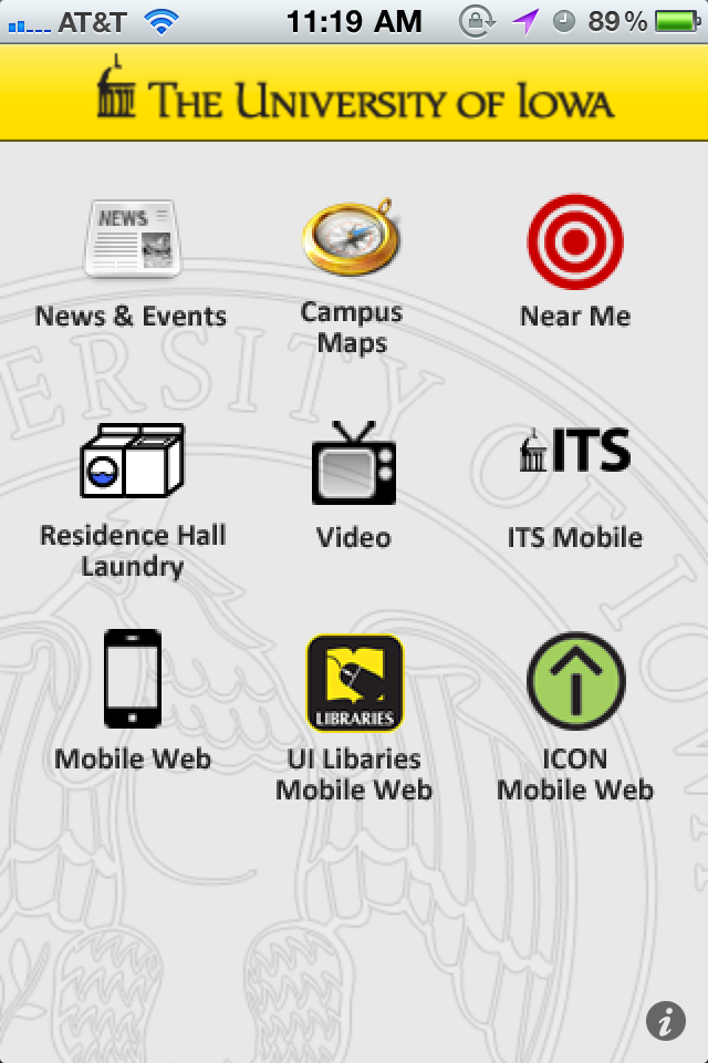 The second app released by Iowa’s ITS department is simply called University of Iowa (iTunes link). This app is a native version of the web-app that has been in beta for several years now. The native app does not have as many features as the mobile web site, but it does have several features that users will find useful: news, campus maps, a function to find available laundry machines for those that live on campus, one can manage their library account, manage your printing queue, and (using Apple’s web-view API) open mobile ICON.