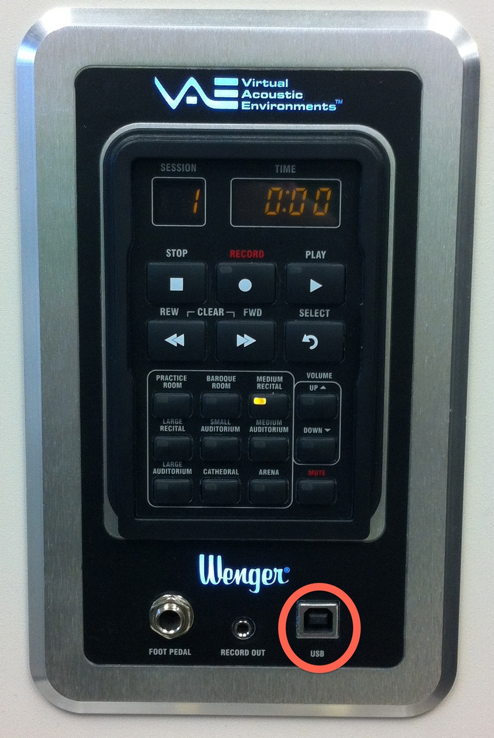 As many of you know, The University of Iowa was flooded in the spring of 2008. The Voxman Music Building was irreparably damaged, so the School of Music has been in temporary facilities since that time. The university contracted Wenger to install offices and practice rooms in our temporary facilities. These practice rooms have a module in the wall that allows the user to modify the sound by selecting any of a number of sound options, such as “Practice Room,” “Large Recital,” and several other options. I believe that this has been the primary usage of these modules. On occasion, I witness students using the built-in recording and playback feature. The opportunity to get instant feedback is an essential tool for developing (and professional) musicians. There is, however, a feature that I believe has gone completely untapped. As one can see from the image below, there is a device-end USB port on the module; this is the same device end as your USB printer cable (the same cable works here).