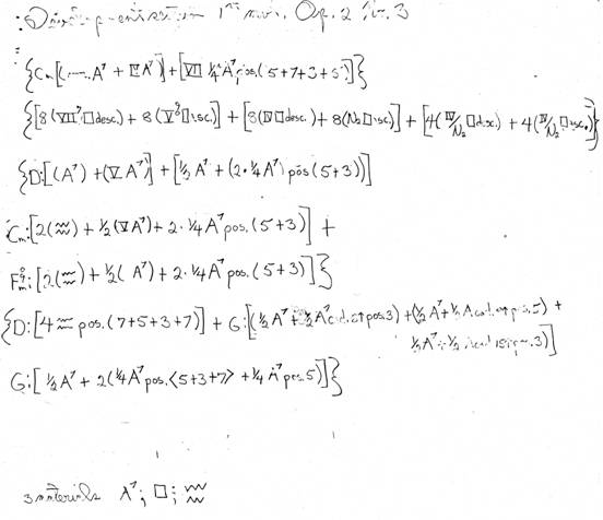 Another even more idiosyncratic technique I use is that I have developed a way of notating the structure of sonata allegro form using something like algebraic formulas. Below are the formulas for Beethoven’s Op. 2. No. 3 (a piano sonata.) I sometimes use these formulas in our theater works, such as for the “overture” of Street Scene. It is a kind of sonata allegro form but played by sirens. Aletheia makes extensive use of this technique throughout the work. Perhaps we can go over this someday if you write your dissertation about our work. It is difficult to explain in text, but easy to demonstrate in person. I developed this method when Abbie and I were students. We also used it to write some solo trombone works and Music for the End of Time. Anyway, here are two examples of the formulas. I create the genetic material with the cells, and give them form with these formulas.